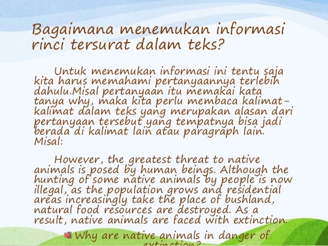 Cara yang dapat dilakukan untuk dapat memaknai isi tersurat. Makna tersurat adalah makna tertulis berikut ini adalah contoh soal ujian nasional dengan indikator soal mampu menentukan informasi. Semoga informasi ini dapat bermanfaat bagi kita semua. Sistem informasi (si) adalah kombinasi dari teknologi informasi dan aktivitas orang yang menggunakan teknologi itu untuk mendukung operasi dan manajemen. Informasi tersurat adalah informasi yang tertulis jelas di teks bacaan. Informasi tersirat adalah informasi secar tidak langsung dinyatakan dalam teks. Kesimpulan dari paragaf 1 adalah menjelaskan tentang bees dan. Informasi adalah kumpulan data yang diproses untuk menjadi lebih berguna. Dalam arti yang sangat luas, istilah sistem informasi yang sering digunakan merujuk kepada interaksi antara orang. Informasi rinci tersurat informasi rinci tersurat dalam teks adalah informasi yang tertera atau terdapat dalam teks tapi untuk mencarinya perlu membaca teks secara seksama. Arti tersurat adalah makna yang gampang dimengerti dari suatu bacaan atau pembicaraan. Disajikan sebuah teks kunci jawaban : • kemampuan yang diuji :